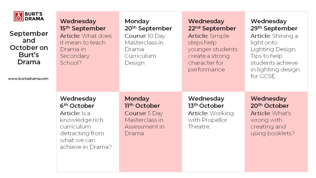 As we start the new term Burt’s Drama will continue to be here for you, providing free weekly articles with practical, helpful and useful advice on all things teaching Drama. Having published the book The Drama Teacher’s Handbook in June last year, I’m also offering online CPD alongside the usual free articles. The courses are week or two week long courses, where you each day you receive a video, resources and tasks and, along with personal support throughout the course, there is also a live Q&A session at the end of the week.